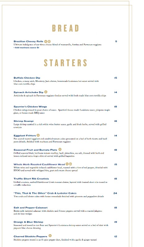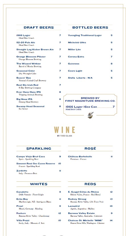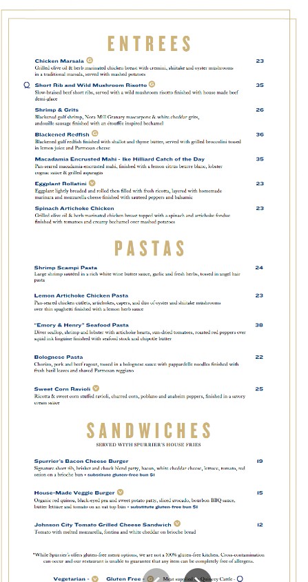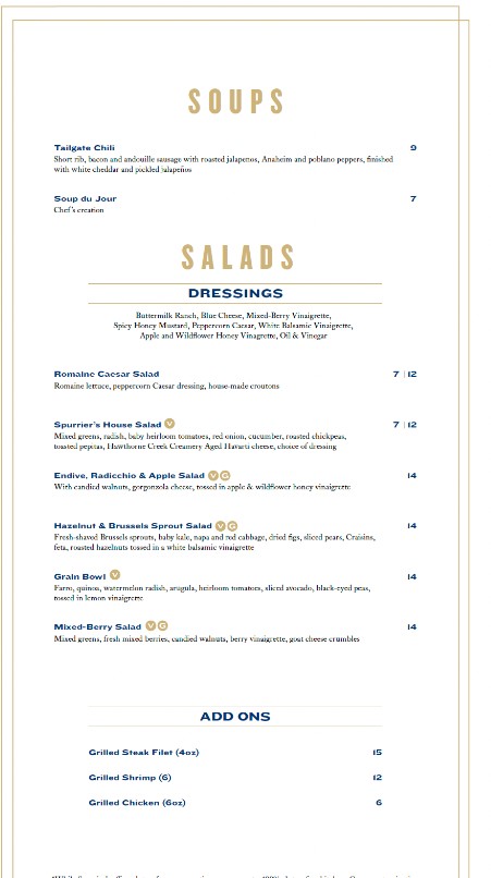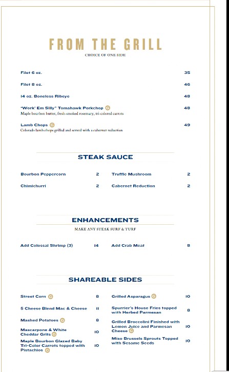 Welcome to the dedicated menu page for Spurrier's Gridiron Grille Restaurant! As one of Gainesville's premier dining destinations, we combine a passion for elevated cuisine with an unforgettable atmosphere celebrating Florida football history. Whether you are joining us for a celebratory dinner or a special occasion, you can browse the complete Spurrier's Gridiron Grille Restaurant menu here. Discover our selection of perfectly aged steaks, innovative seafood dishes, handcrafted cocktails, and fine wines. View our current offerings and prices below to plan your exceptional fine dining experience.