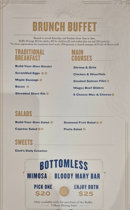 I had seen this restaurant on YouTube, checked Google reviews, and it looked really good to me. Although I am not a huge sports fan, I, my girlfriend, and the group that I was with, absolutely loved it. We were there on a Sunday afternoon for the brunch buffet, and we were blown away at the selection of food available. We were also in amazement at all the wonderful presentations and display cases of awards given to Steve Spurrier. The restaurant is spacious, clean, well decorated, and there’s more than adequate spacing between all of the tables, making it easy to move around. The buffet had fried chicken and waffles, outstanding custom omelettes which were cooked to perfection, Wagyu beef sliders, huge bacon strips, sausages, cornbread casserole, and various small desserts. Darius, our server, was lots of fun, extremely professional, and very attentive. In my opinion, it’s well worth the $35 per person for this outstanding brunch buffet.